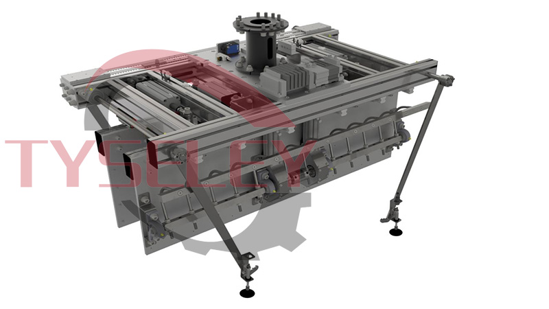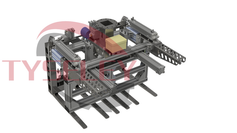 此机器人末端执行器为三合一复合型夹爪夹具,拥有拆包、提包以及抱夹托盘的功能。